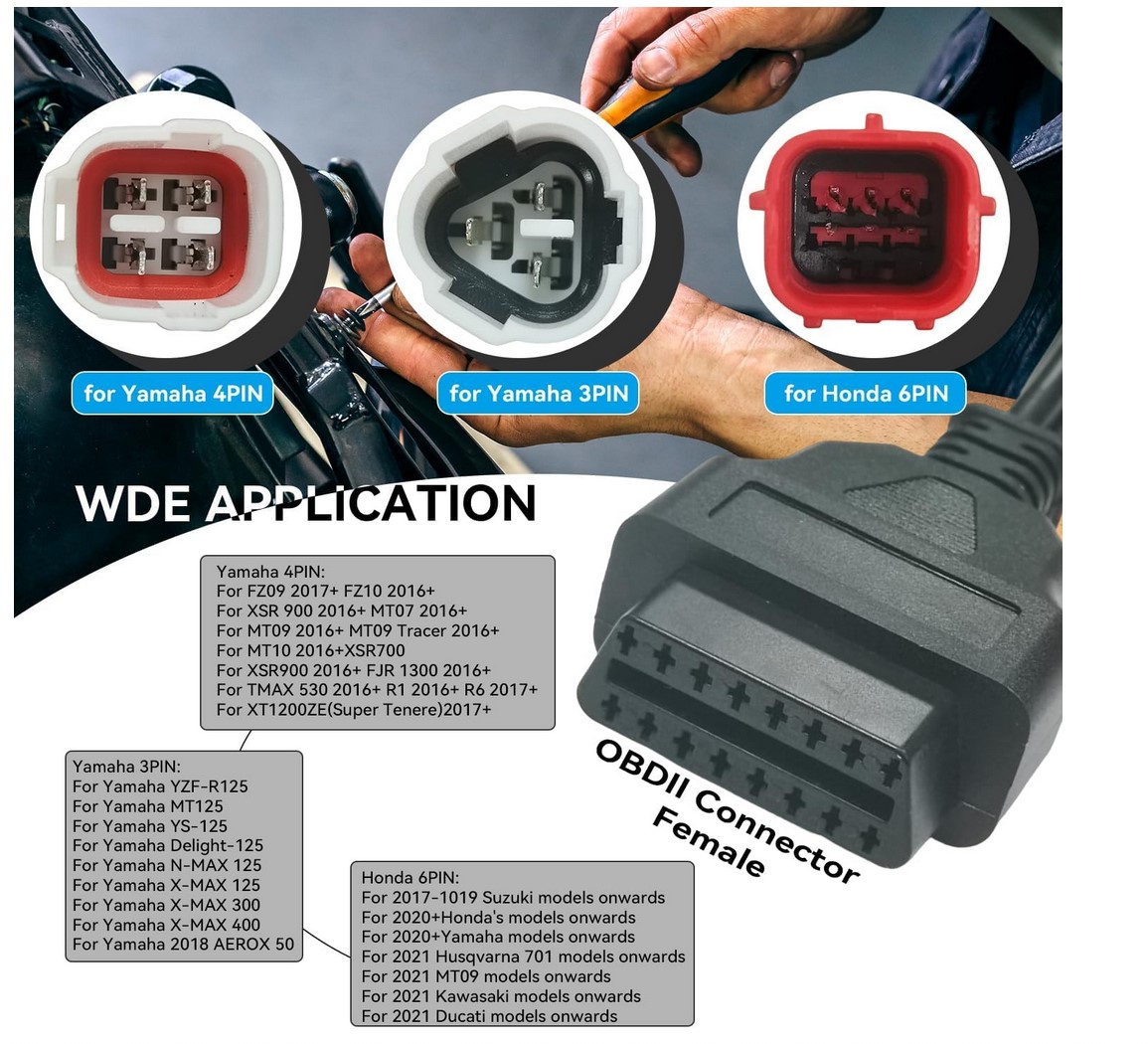 - Lämplig för Yamaha MT10/FZ10/MT09/MT07/R1/TMAX 530 2016/XSR700/R6 2017 motorcykel och 6-stiftskontakt passar för Honda Moto Guzzi V100/V85TT, Piaggio 6-pin, Vespa 6-pin, Duke R 890/390/390/390 00/39 00: Suzuki GSX-S. 1000 GT, Honda 6-polig diagnoskabel som KLR650, KLX230S, Z900RS, Ninja 400 och Ninja 650.