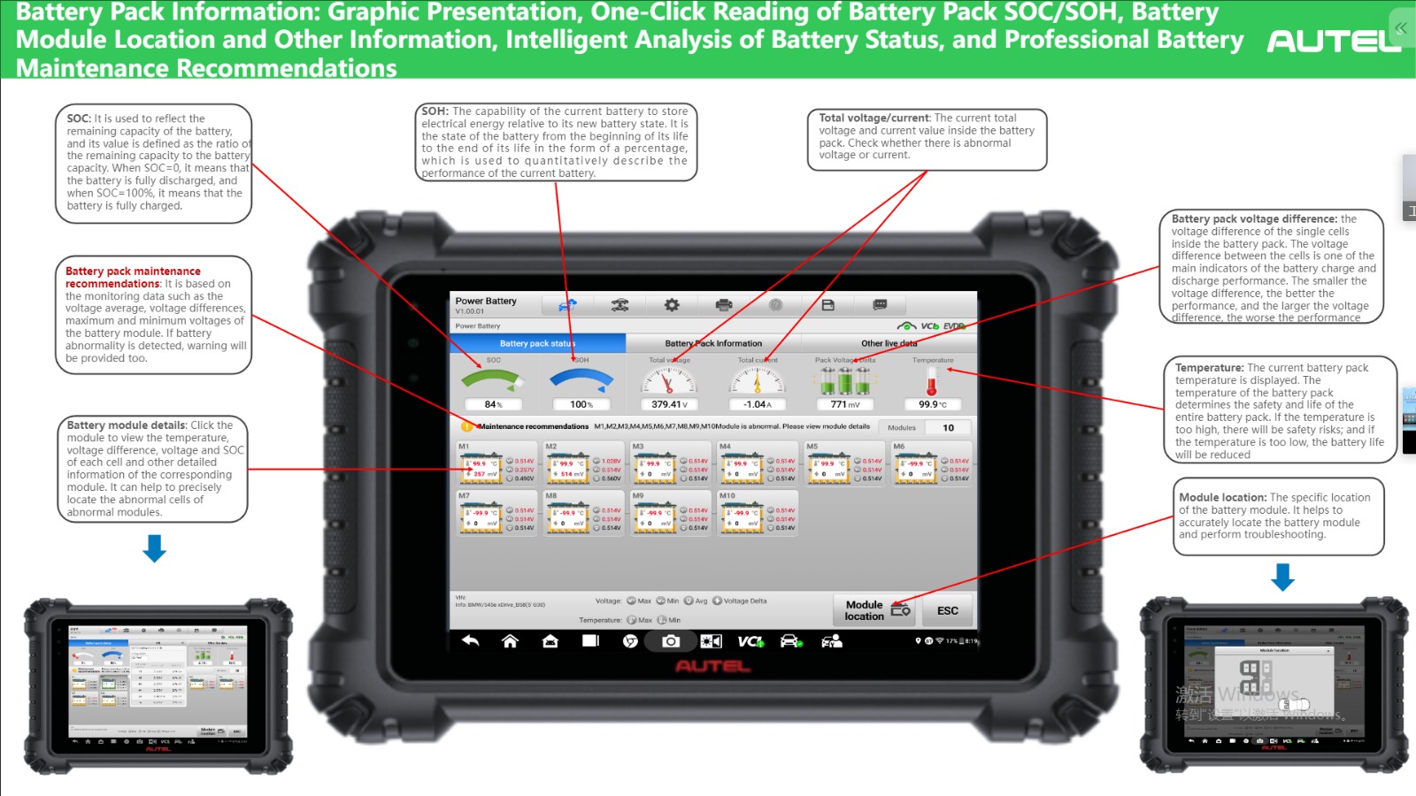 Avancerad batteridiagnostik – Läs ut State of Charge (SoC) och State of Health (SoH) för att snabbt bedöma batteriets skick och prestanda.