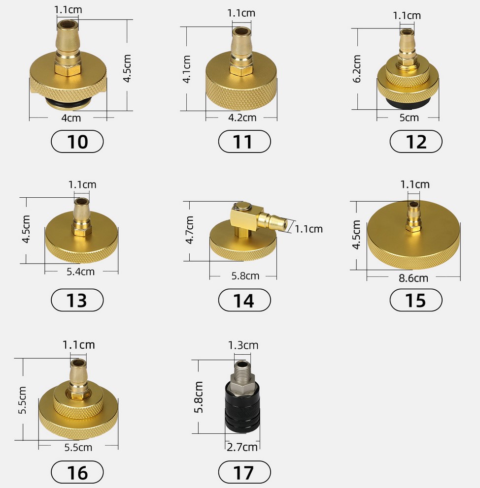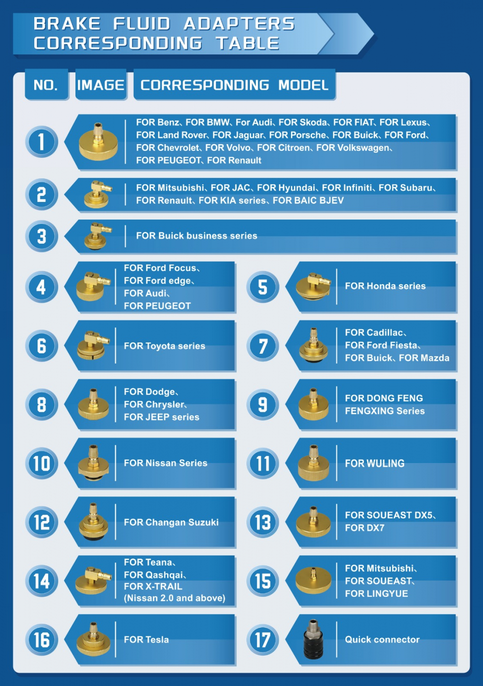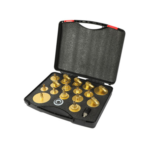 AUTOOL:s 17-delars adapterkit är det perfekta tillbehöret för dig som vill byta eller fylla på bromsvätska på ett professionellt sätt. Med 16 olika adaptrar och en snabbkoppling passar kitet till de flesta fordonstyper och fungerar sömlöst tillsammans med AUTOOL:s bromsvätskebytesmaskiner som AST605, AST609 och liknande modeller.