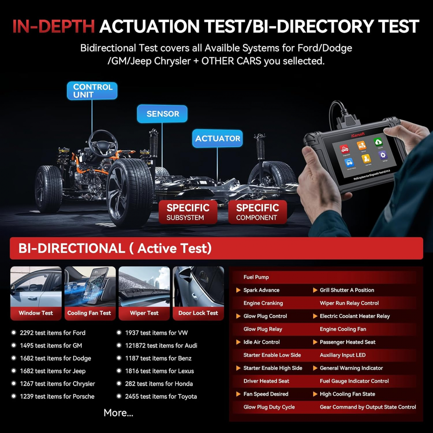 - Bidirektionell kontroll: Skickar kommandon och tar emot information för att utföra tester som fönster-, spegel-, dörrlås- och gasreglagejusteringar.