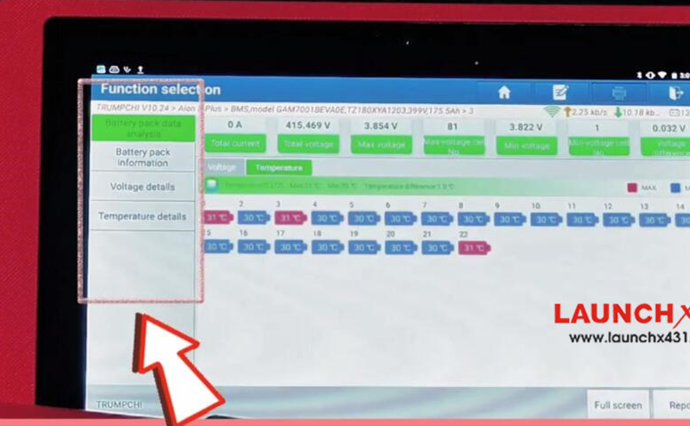 Med detta kit kan högvoltsbatterier (HV-batterier) testas även när de är frånkopplade eller helt borttagna från fordonet. Diagnosenheten ansluts direkt till HV-batteriet via medföljande adapterkablar, vilket gör det möjligt att kontrollera spänningen och temperaturen för samtliga battericeller. Den totala spänningen för hela HV-batteriet kan också visas.
