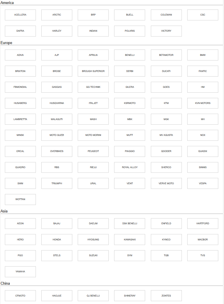 BMW, KTM, Ducati, Benelli, Piaggio, Aprilia, Vespa, Moto Guzzi, Triumph, CF Moto, Polaris, CAN AM (BRP), Peugeot, Harley-Davidson, Yamaha, Kawasaki, Honda, Suzuki, Kymco, Hartford, PGO, SYM, Aeon, Adiva många fler. 89 märken just nu.