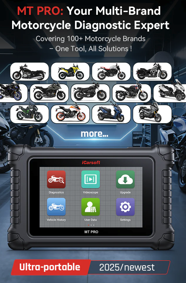iCarsoft MT PRO är det senaste intelligenta multimärkes-diagnosverktyget för motorcyklar och många ATV, utvecklat av iCarsoft år 2025.
