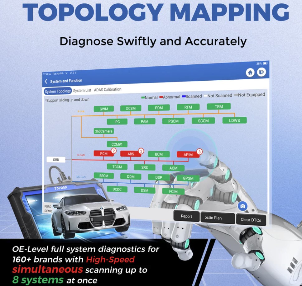 Topologikarta ger en tydlig visuell översikt av fordonets samtliga system och deras inbördes kommunikation, vilket gör det enklare att snabbt lokalisera fel. Verktyget kan även skanna flera system samtidigt för att spara tid vid diagnos.