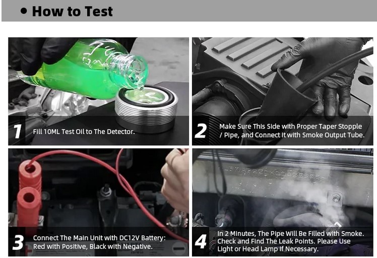 Rökmaskinen kommer nu producera tjock väl synlig rök, låt maskinen gå minst 2 minuter, utvärdera sedan resultatet, använd gärna ficklampa. Rökmaskinen levereras med gummislang, flera olika koniska tätningar (proppar) och en pipflaska för påfyllning av olja. Maskinen kan smidigt hängas upp på motorhuven under användning. Speciellt propparna är användbara om man vill avgränsa en del av systemet eller testa en enskild slang efter läckage.
